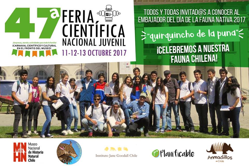 Por último participamos el 11-12 y 13 de octubre en la 47ª Feria Científica Nacional Juvenil, en el Museo Nacional de Histaria Natural, con nuestros amigos de Planificable y el equipo del Instituto Jane Goodall. Invitando a todos los asistentes a conocer al embajador del día de la fauna nativa 2017; El quirquincho de la puna. Con actividades como el Desafío Origami , Taller de dibujo científico , votación del quirquincho favorito entre otros. Fueron días espectaculares y muy movidos.