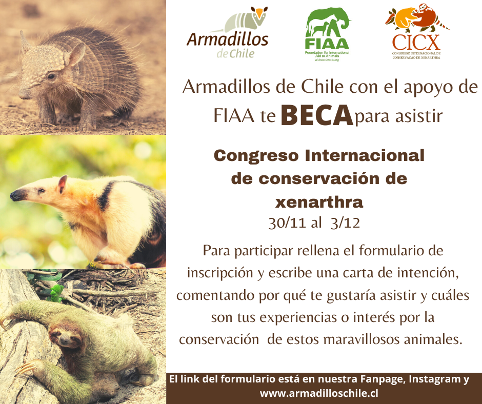 Armadillos de Chile con el apoyo de FIAA ( Foundation For International Aid To Animals) te becan para asistir al Primer Congreso Internacional de Conservación de Xenarthra, que se realizará el 30 de noviembre al 3 de diciembre 2020. Esta Beca cubre el 100% del ACCESO 1 ( Certificado de participación digital de 20 horas)